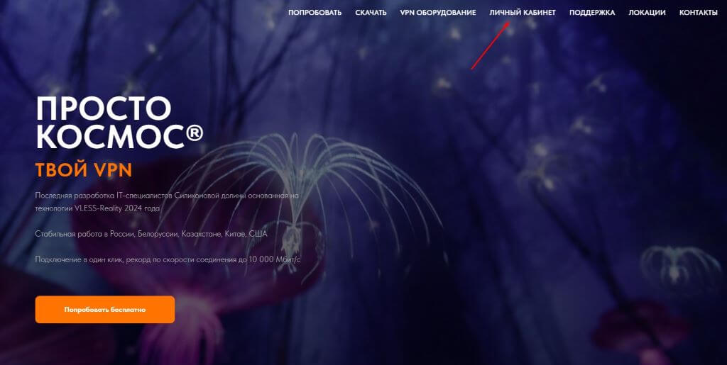 Нажмите на кнопку «Личный кабинет» на сайте VPN «Просто Космос»: