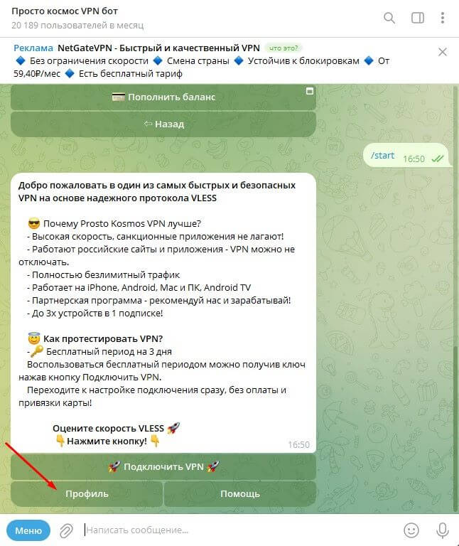 Для получения доступа к функционалу ВПН «Просто Космос» предлагается удобный Telegram-бот, который автоматически регистрирует каждого пользователя в системе. Для перехода в него воспользуйтесь кнопкой в верхней части данной страницы, либо сделайте это с официального сайта.