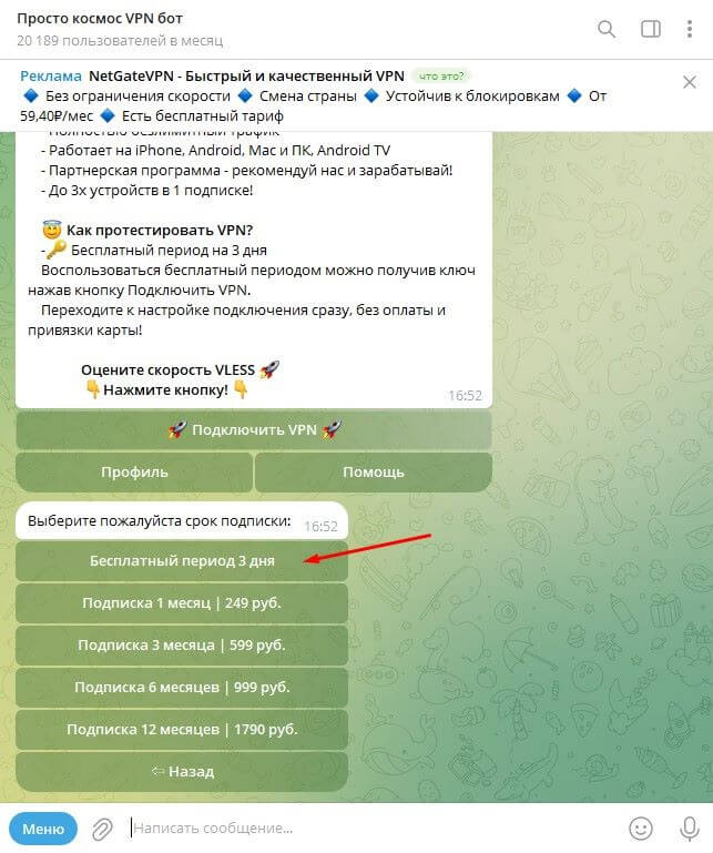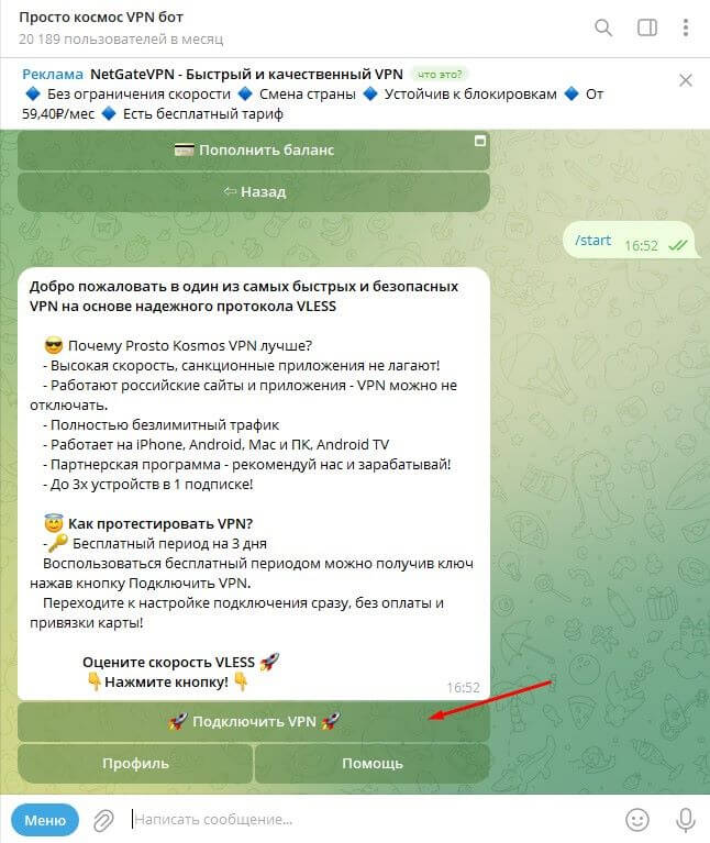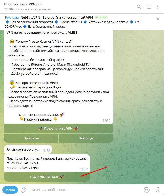 Для получения бесплатной версии «Просто Космос» на 3 дня, необходимо нажать на кнопку «Подключить VPN»: